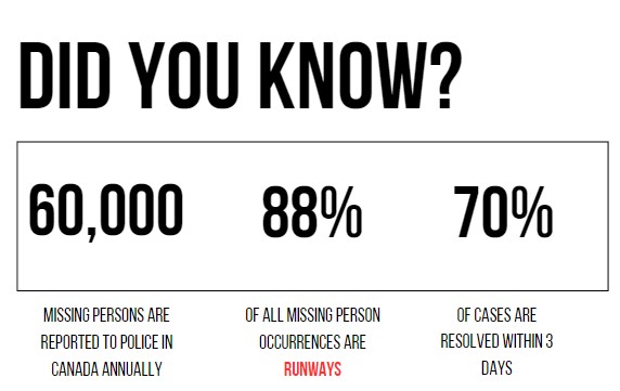 In May 2024, the National Centre for Missing Persons and Unidentified Remains (NCMPUR) released a report, Exploring the Phenomenon of Reported Runaways in Canada 2015-2021 available through the Canada’s Missing website. It emphasized the importance of increasing awareness and putting effort into prevention. Read the report here: Exploring the Phenomenon of Reported Runaways in Canada 2015-2021 - National Centre for Missing Persons and Unidentified Remains