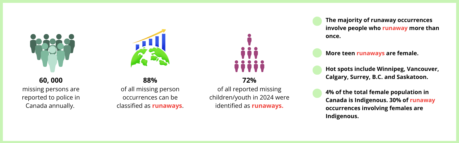 - 72% of all reported missing children/youth in 2024 were identified as runaways.