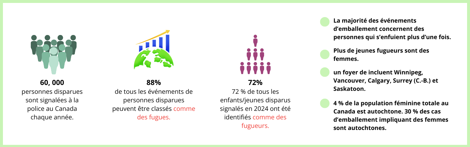 En mai 2024, le Centre national pour les personnes disparues et restes non identifiés (CNPDRN) a publié un rapport intitulé Exploration du phénomène des fugueurs signalés au Canada 2015 à 2021, disponible sur le site Web canadien des personnes disparues. Il a souligné l’importance d’accroître la sensibilisation et de déployer des efforts en matière de prévention. Lire le rapport ici: https://canadasmissing.ca/pubs/2024/runaways-fugueurs-fra.htm