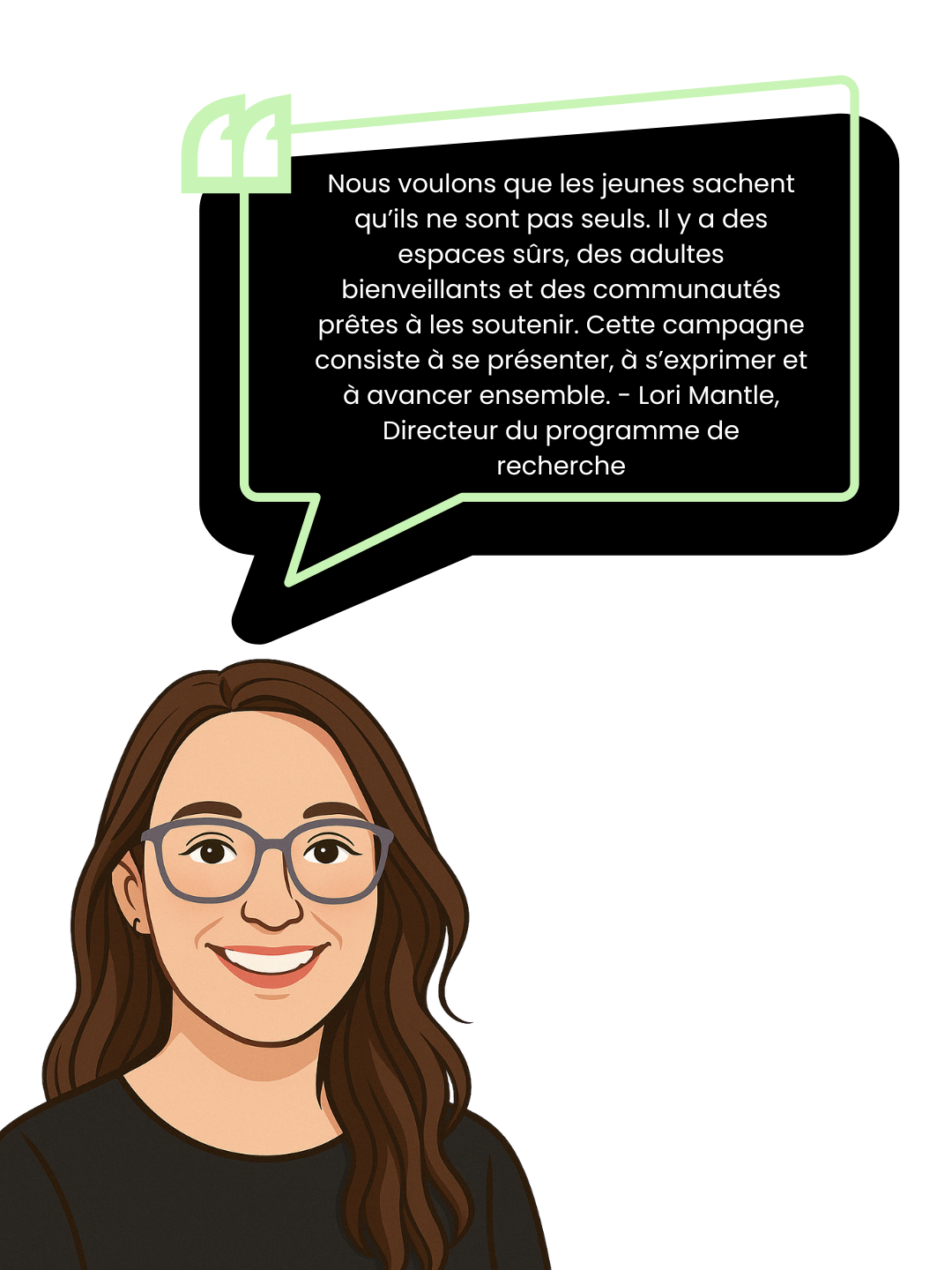 • Apprendre et éduquer: Renseignez-vous sur les signes avant-coureurs et sur la façon d’écouter et de répondre lorsqu’un jeune a besoin d’aide. Partagez des ressources avec vos amis et votre famille afin qu’ils puissent également être conscients.